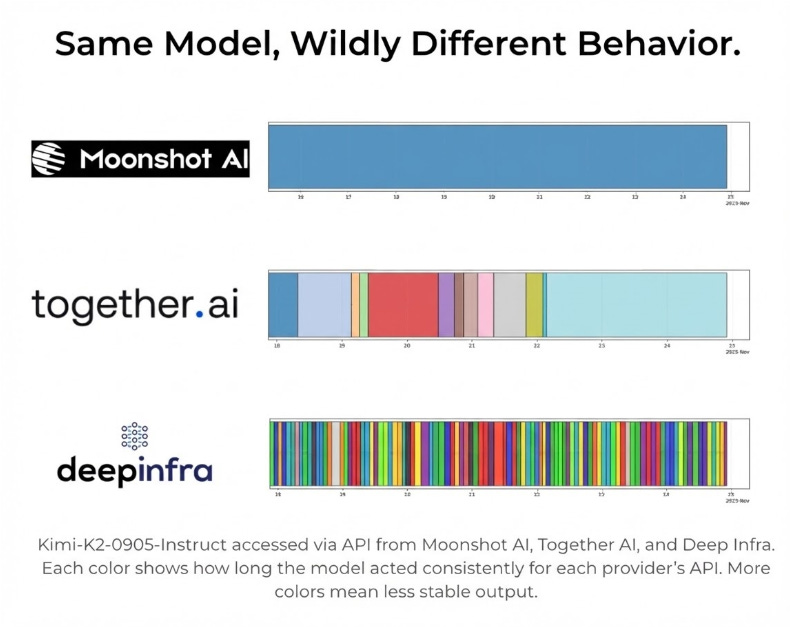 Through our model informatics work, we’ve been able to develop methods to continuously monitor AI models through APIs from different inference providers to track instability. The results were shocking to see. The same model hosted by different providers showed significant variance between them.